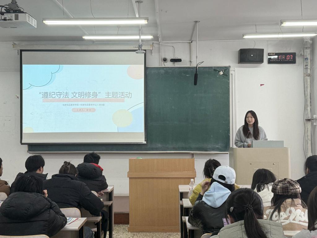 各班级开展“遵纪守法,文明修身”的主题班会活动,全院各年级学生共同参与。