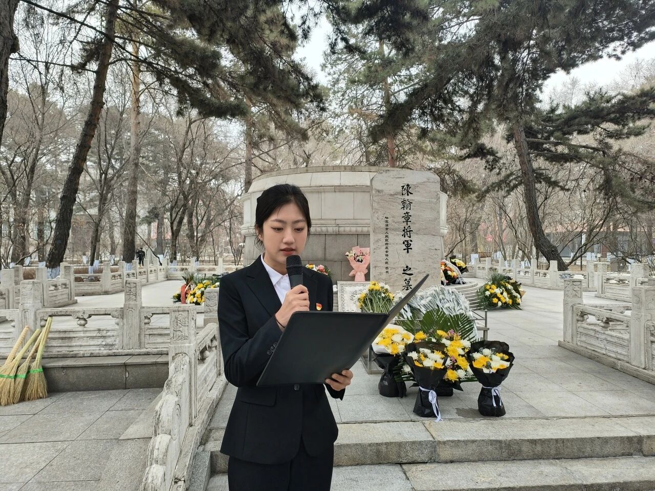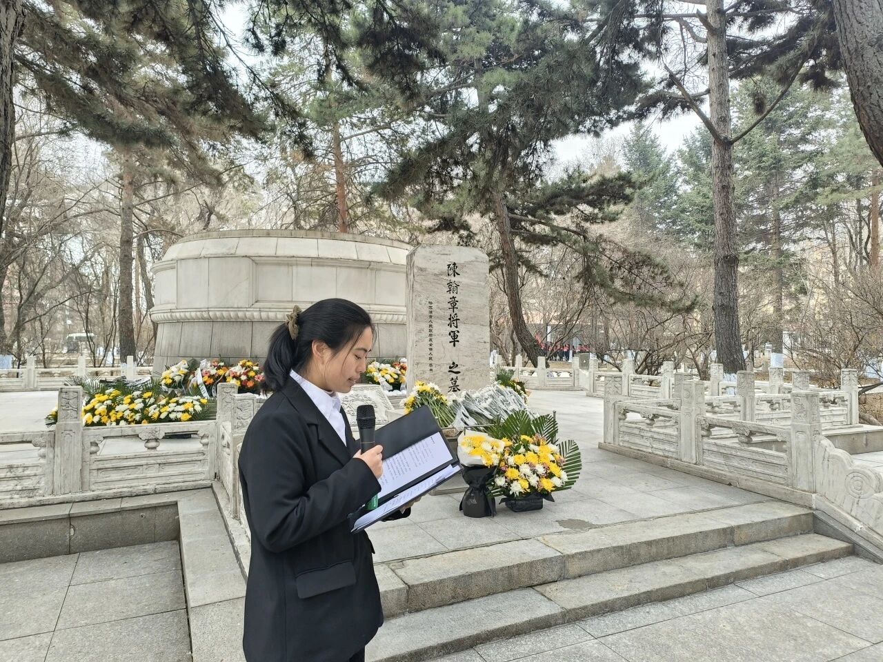 志愿者代表手捧鲜花,缓缓走向烈士墓,郑重敬献鲜花,全体人员面向烈士墓默立,向为民族解放、国家富强英勇献身的革命先烈致以最沉痛的哀悼。
